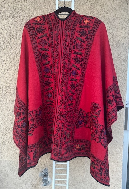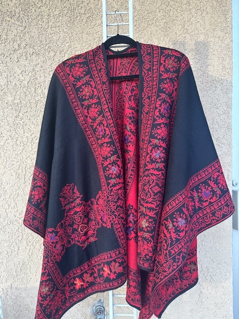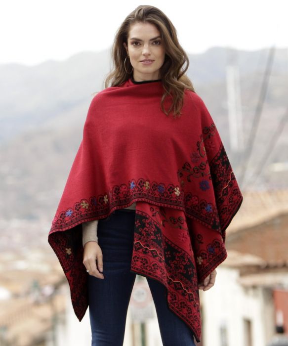 Stunning alpaca blend red ruana with hand emboidery around the edges.  Reverses to black base.