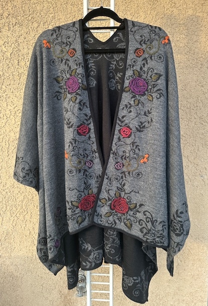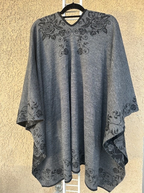 Reversible gray/black alpaca ruana with hand embroidered roses. Black trim around edges. Versatile stunning statement piece!