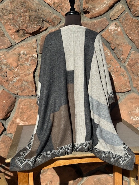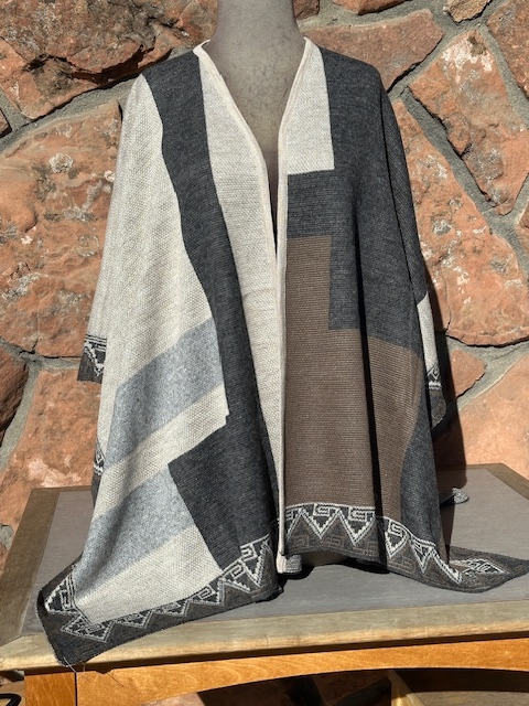 Elegant geometric design in natural earthtones make this alpaca blend ruana a standout! Stunning simplicity with clean lines. Wrap yourself or someone special up in this statement piece.