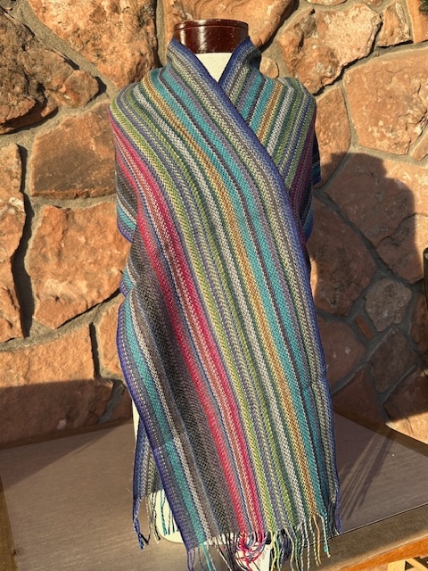 Hand woven in Peru, this beautiful scarf is 100% baby alpaca with stripes of bright spring-tone colors – blues, purples, acqua, greens, rose, pink, etc. Fringed. Perfect accent wardrobe piece.