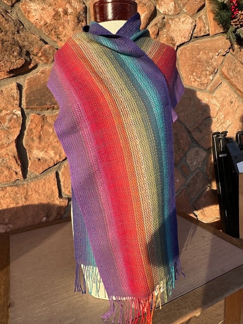 Bright colors of the rainbow fade from stripe into next stripe of this stunning handwoven 100% baby alpaca scarf. Luxiously soft with fringe accents at each end.